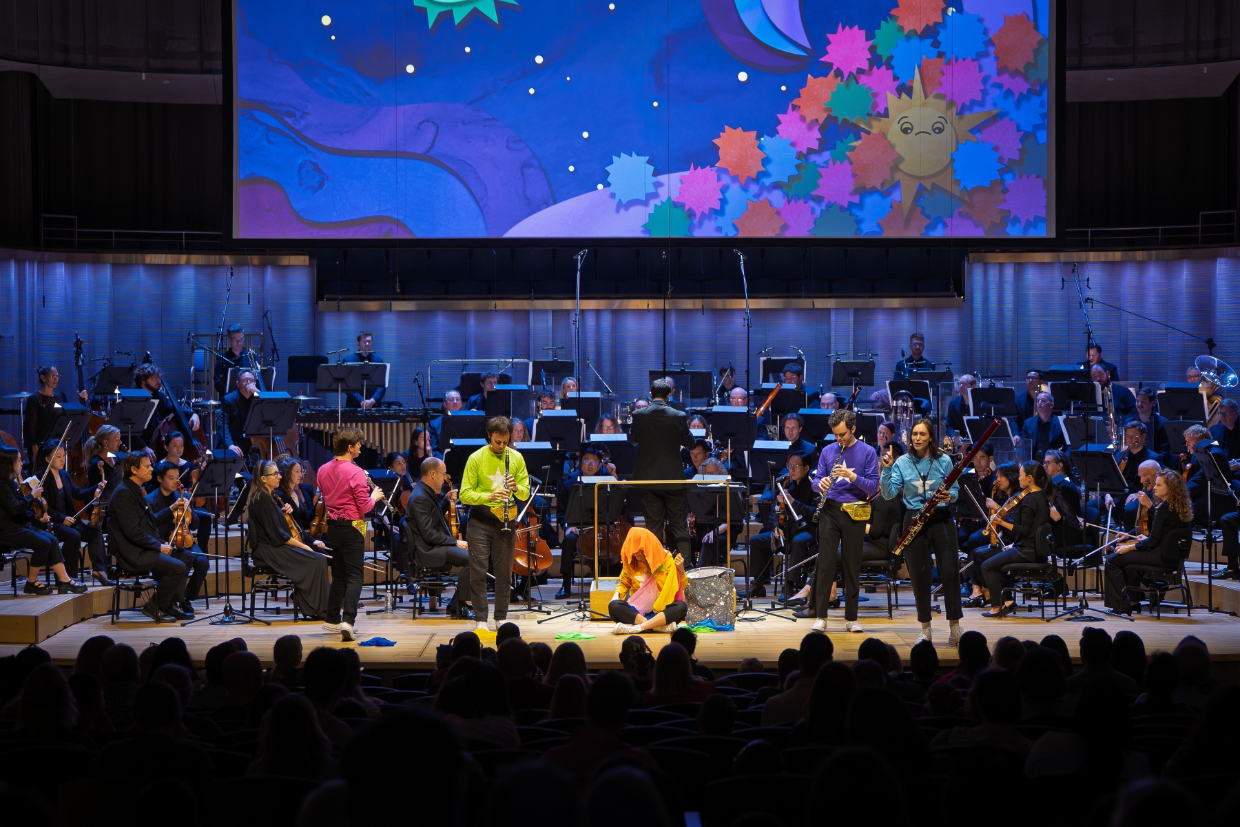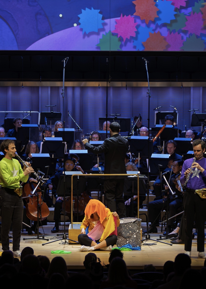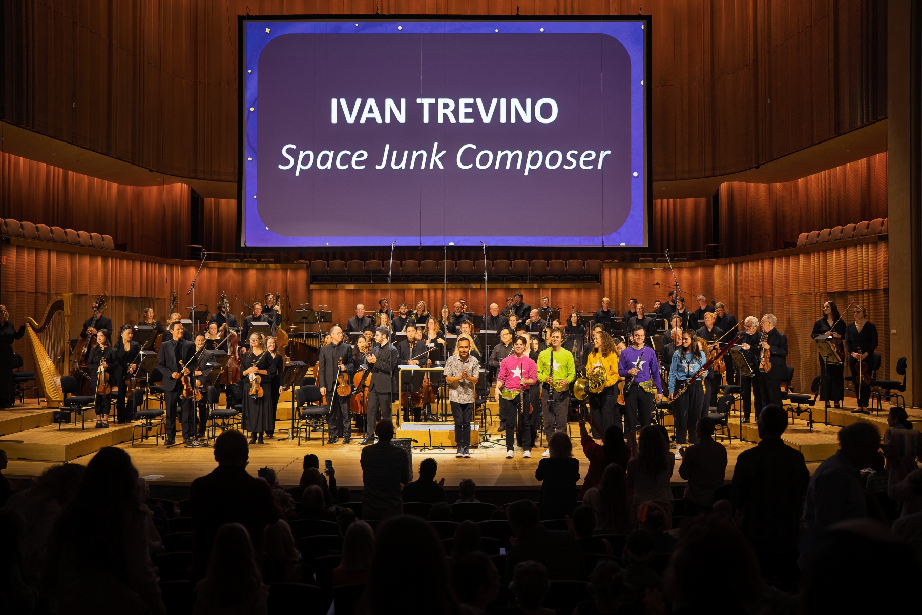 An audience of over 1,000 kids (and kids at heart) sang, laughed, and cheered for the San Diego Symphony and WindSync, who gave the world-premiere performance of my new piece, Space Junk, a Symphonic Children’s Story, on April 11, 2026. The project was two years in the making, and started when the WindSync team reached out to me looking for an alternative to their Peter and the Wolf arrangement. It just so happened San Diego Symphony was also looking for something new for young audiences. We all hopped on a zoom call and I shared Space Junk, a children’s story that I wrote ten years ago about a little star who gets covered in floating space debris, makes her way out, and turns the scattered junk into something beautiful. I had previously set this story to music for percussion, but the team agreed this was the story they were looking for, and asked me to create a new work for orchestra featuring WindSync. The piece features narration, theatrics, props, and audience participation including singing and clapping along (we got a group of 1,000 kids to sing and clap in rhythm!)